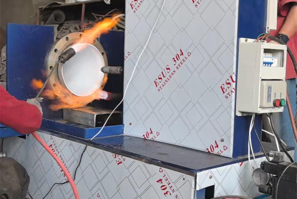 钢衬塑管道翻边设备采用加热 — 扩径 — 定径 — 降温四步闭环标准化工艺,搭配自主设计的翻边模具结构。通过脚踏开关控制顶杆运行,实现模具便捷切换与顶杆伸缩精准配合,全程自动化程度高,单根管道翻边加工可在 5 分钟内完成,确保成型质量稳定。